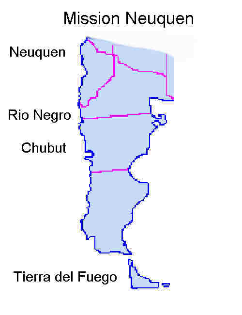 La Gran Misión NeuquénBoundariesThe boundaries of the mission basically include the region called Patagonia. It starts up top with the providences of Neuquen and Rio Negro. Then it continues through the rest of the provinces until the bottom of the country/continent. That also includes the island Tierra del Fuego. In the MTC you can ask for a map with the boundaries drawn on it and they will supply you with one. Update: In June of 2005, Tierra del Fuego and Rio Gallegos were made part of the Buenos Aires North mission, as missionaries were having to fly through Buenos Aires en route to the south end of the mission. Truly a sad day for those of us who served there, although I'm sure it was done in wisdom.