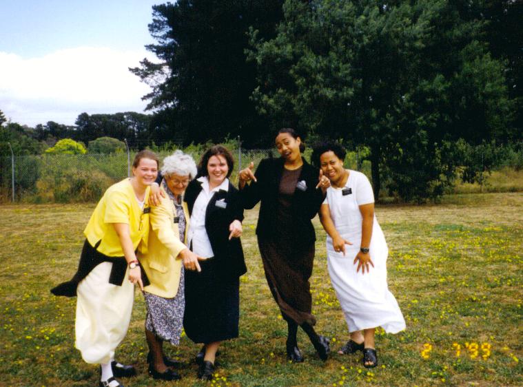 Nanette Hennis Sisters (Johnson) Hennis, Flitton, Donovan, Tilialo, and Aumua; pointing to what was the future temple site (it's built now), in Wanterna. 17 Nov 2003