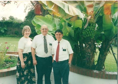 aqui estoy con pres y hna Lemmon, un dia que nos invitaron a almorzar en su casa..